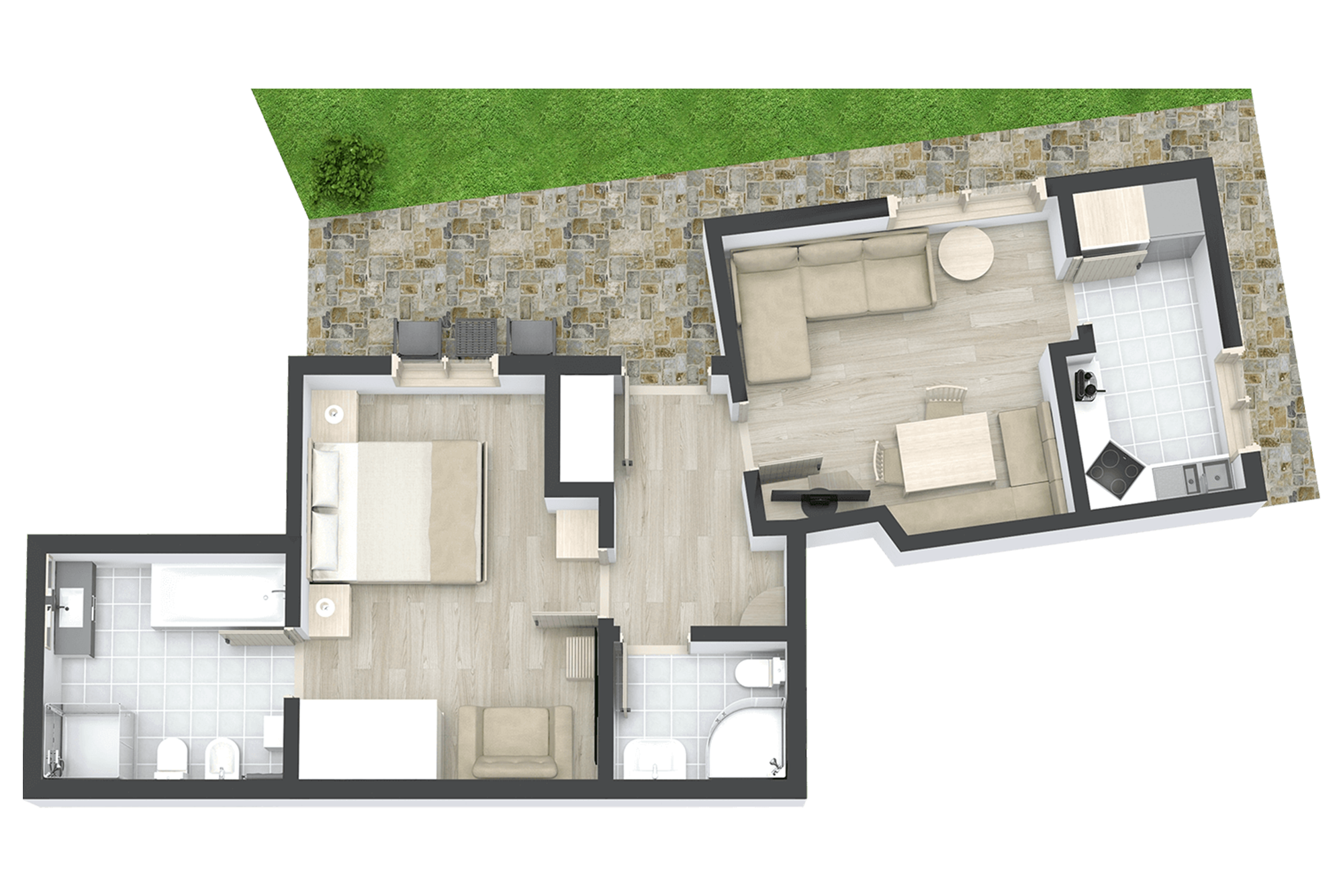 Appartamento molto confortevole per 2-3 persone, composto di cucina, un bagno spazioso e uno più piccolo, una stanza da letto (letto matrimoniale + divano letto) e un bel soggiorno con terrazzino coperto. L'appartamento ha diretto accesso al giardino con possibilità di mangiare all'aperto e di rilassarsi.