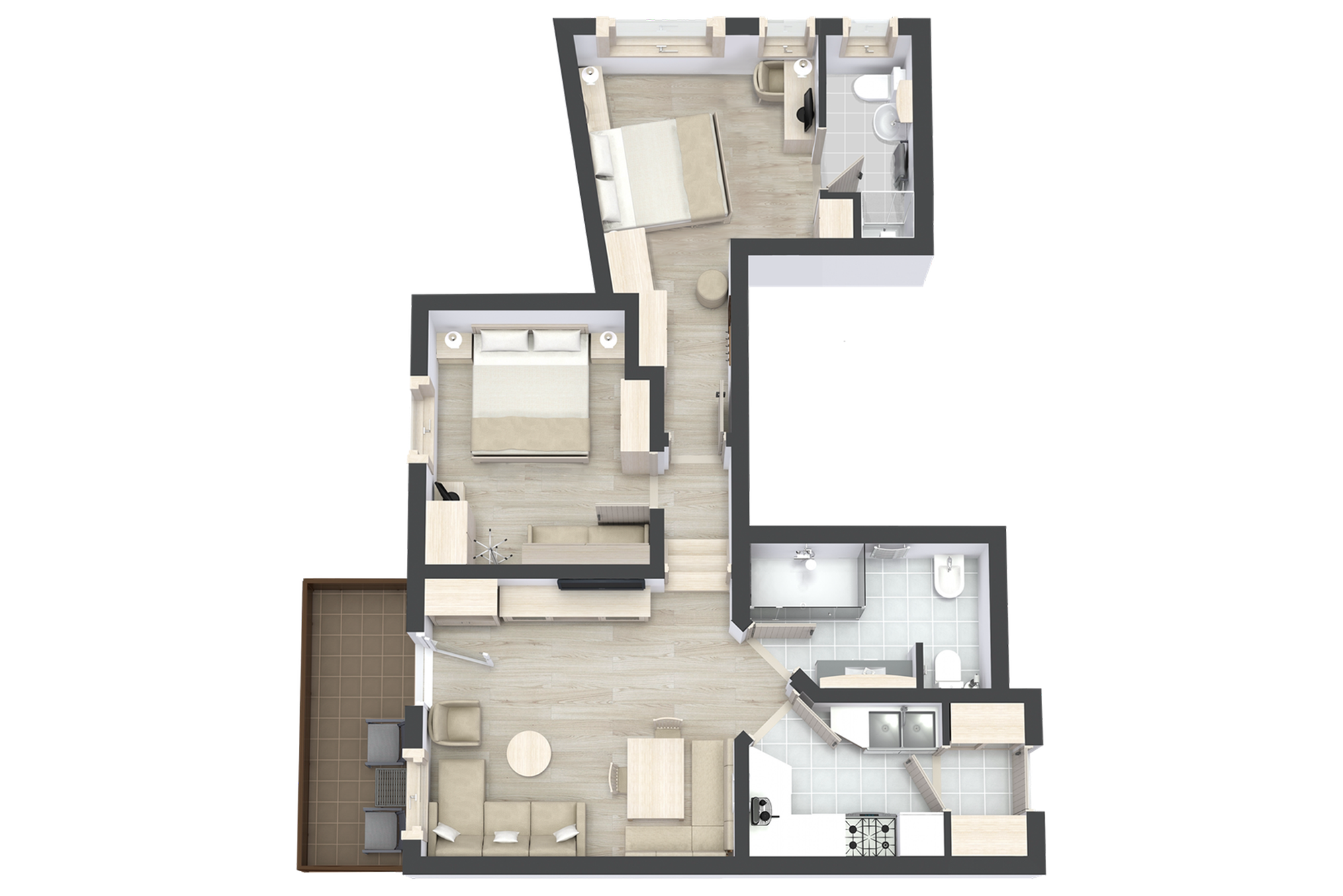 Appartamento molto confortevole per 4-6 persone, composto di cucina, un bagno molto spazioso e uno piccolo, due stanze da letto (di cui una con un letto matrimoniale + divano letto), un ampio soggiorno (con divano letto matrimoniale) e un balcone soleggiato.